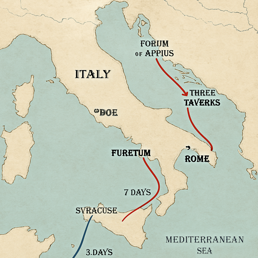 Tres meses después del naufragio, zarpamos en otro barco, que había pasado el invierno en la isla; era un barco de Alejandría que tenía como figura de proa a los dioses gemelos. Hicimos la primera parada en Siracusa, donde nos quedamos tres días.